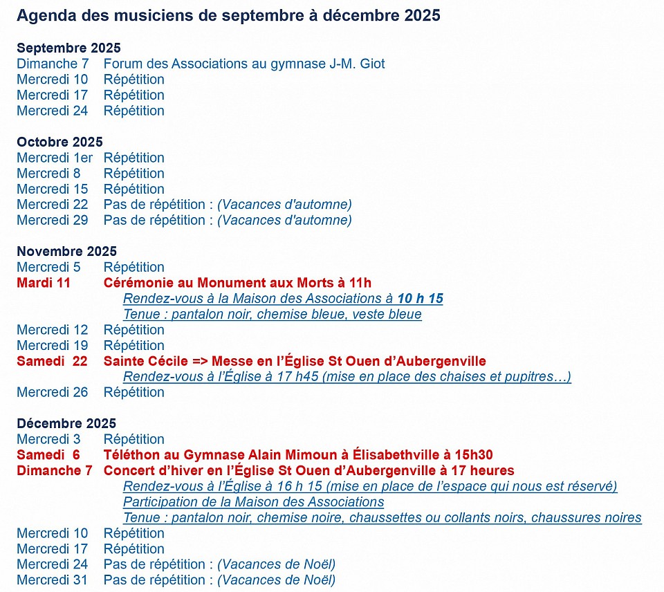 (les dates et infos sont notées en rouge dans l'agenda des musiciens)